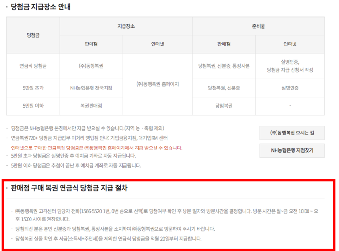 이상 연금복권 당첨번호 보는법에 대해 자세히 알아보았습니다. 연금복권 당첨금 지급처는 동행복권, 농협은행, 판매점입니다. 하지만 연금복권이 훼손되거나 분실된 경우 당첨금을 받을 수 없으므로 복권 구매 내역이 남아있는 온라인 구매를 추천드립니다.