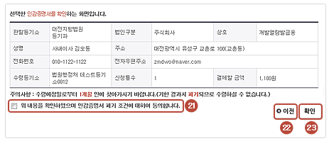 마지막으로 입력한 내용이 맞는지 확인하고 ‘위 내용을 확인하였으며 인감증명서 폐기 조건에 대하여 동의합니다’를 선택합니다. 하단에서 확인 버튼을 클릭합니다.