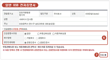 인감증명서의 유형을 일반, 부동산 매도용, 자동차매도용 중 하나 선택합니다. 매수형태에 개별매수인지 공동매수인지 표시한후 하단에서 다음을 선택합니다.