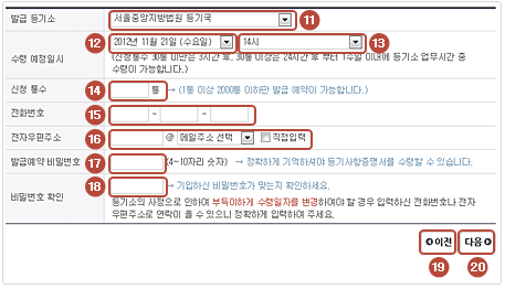 예약할 등기사항 증명서를 발급받는 등기소를 선택하고 수령예정일을 선택합니다. 신청 통수와 전화번호, 전자우편주소를 입력하고 발급 예약 비밀번호와 비밀번호 확인란을 채웁니다. 하단에서 다음을 선택합니다.