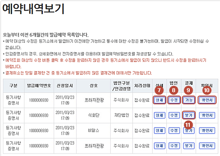 예약내역보기 화면이 표시되면 예약된 등기사항 증명서가 표시되며 확인서를 클릭하면 결재 처리된 단위로 결제 확인서를 출력 가능합니다.