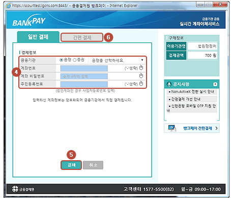 여기서는 계좌이체를 선택하였으며 금융기관, 계좌번호, 계좌 비밀번호, 주민등록번호를 입력하고 하단의 결제 버튼을 클릭합니다.