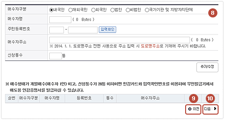 만약 인감증명서 유행 선택에서 부동산매도용 및 자동차 매도용을 선택할 경우 위와 같은 화면이 표시됩니다. 여기에는 매수자 구분, 매수자명, 주민등록번호, 매수자 주소, 신청 통수를 입력하시고 하단의 다음을 클릭합니다.