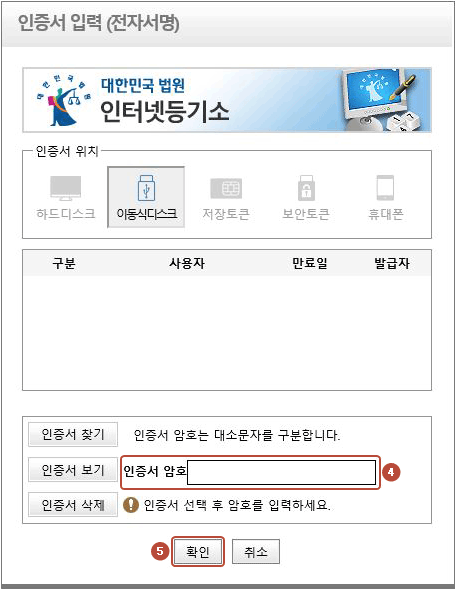 일반 USB 전자증명서를 선택하면 인증서입력 창이 표시됩니다. 여기에서 인증서를 선택한 후 비밀번호 입력란에 비밀번호를 입력해 줍니다. 일반 USB 전자증명서는 회원 전용 서비스로 로그인 후 이용 가능합니다.