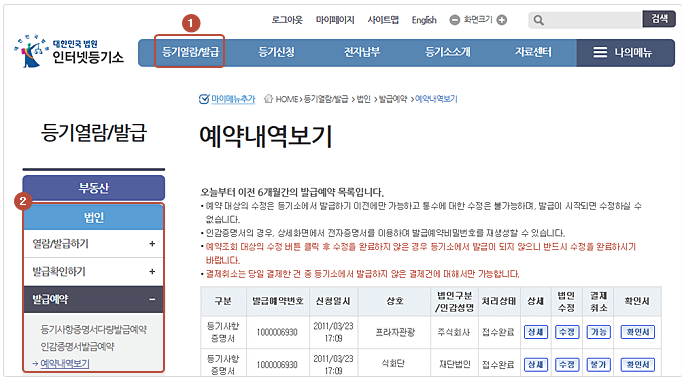 예약내역보기 화면이 표시되면 예약된 등기사항 증명서가 표시되며 확인서를 클릭하면 결재 처리된 단위로 결제 확인서를 출력 가능합니다.