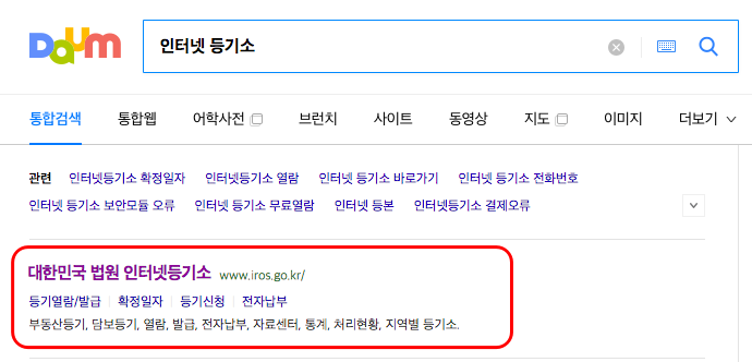 인감증명서 인터넷발급을 하려면 먼저 ‘대한민국 법원 인터넷등기소’ 홈페이지에 이동해야 합니다. 여기서는 다음 포털 검색을 통하여 바로가기해보겠습니다. 이 과정이 어려우시다면 아래를 통해 방문하시기 바랍니다.