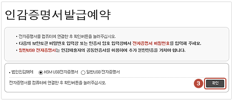 HSM USB 전자증명서 또는 일반 USB 전자증명서 중 원하시는 전자증명서를 선택한 후 확인버튼을 선택합니다.