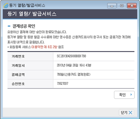결제 성공 확인 창이 뜨면 확인 버튼을 눌러 인감증명서 인터넷 발급을 완료합니다.
