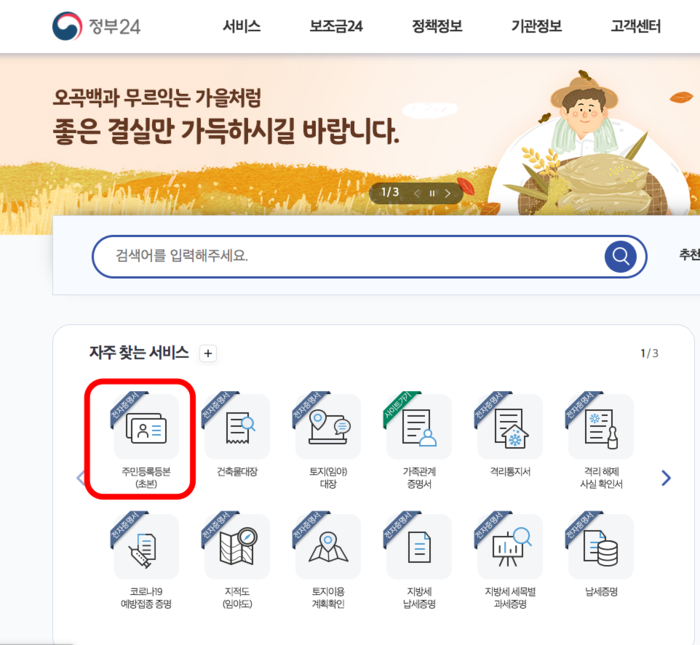정부24 메인 페이지에 도착하면 본문 자주 찾는 서비스 처음에 있는 ‘주민등록등본 (초본)’을 선택합니다.