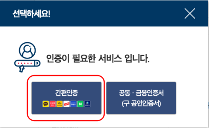 인증 화면이 표시되면 간편 인증 또는 공인, 금융 인증 서중 원하시는 인증 방법을 선택합니다.