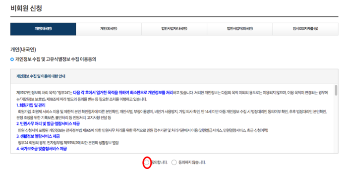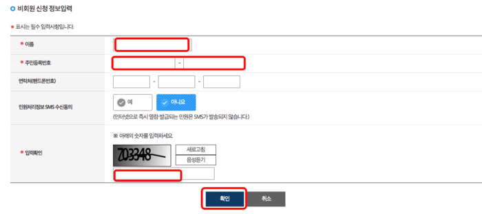 비회원 신청에 대한 개인정보 수집 및 고유식별정보 수집 이용 동의와 고유 식별 정보 수집에 대한 안내를 확인하시고 둘 다 동의합니다에 표시를 합니다.