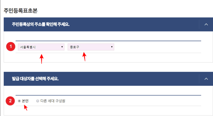 이후 주민등록상의 주소를 선택하고 발급 대상자를 선택합니다. 여기서는 서울특별시 종로구, 발급대상자는 본인으로 하겠습니다.