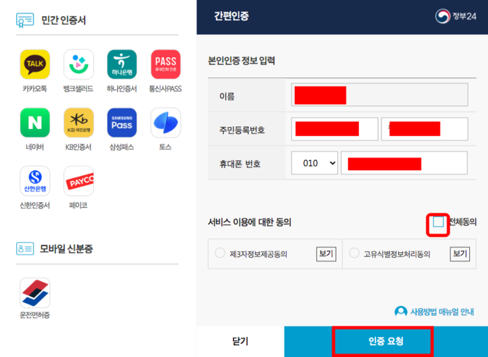 간편 인증 화면이 표시되면 이름과 주민등록번호, 휴대폰 번호 입력 후 서비스에 대한 동의 표시를 하고 하단의 인증 요청을 선택합니다.