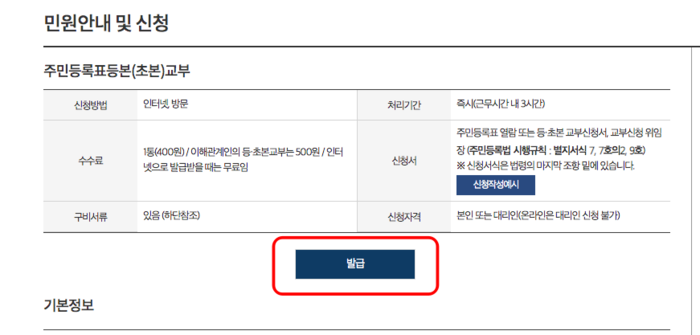 민원안내 및 신청 화면이 표시되면 하단의 발급 버튼을 클릭합니다. 주민등록초본을 방문으로 발급하면 1통에 400원의 수수료가 부과되지만 인터넷 발급의 경우 무료로 이용할 수 있습니다.