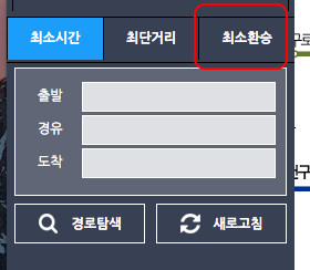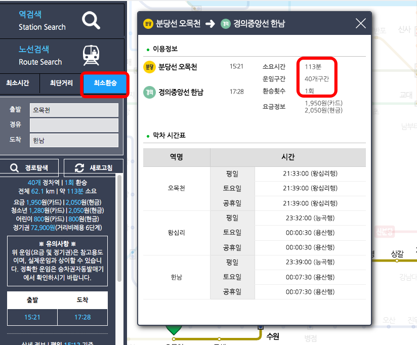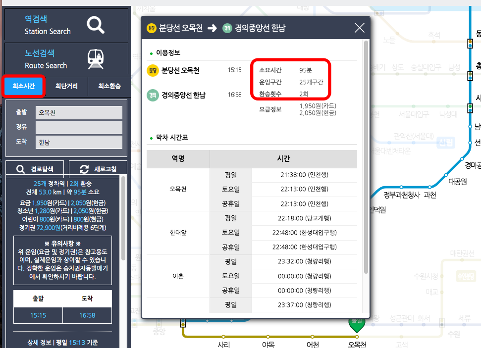 만약 이동거리가 멀고 환승이 많다면 최소 환승으로 표시한 후 검색을 하면 더 좋은 검색 결과를 얻을 수 있습니다. 여기에서는 오목천에서 한남역까지 이동해 보도록 하겠습니다.