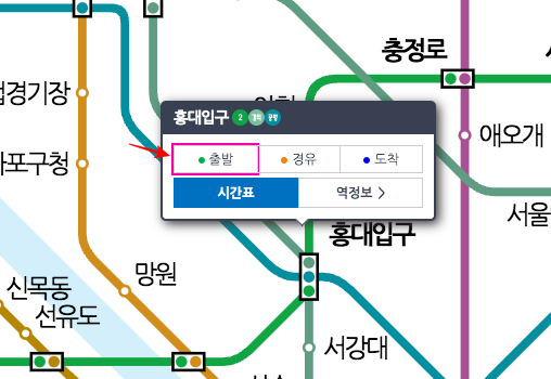 이용하는 방법은 먼저 왼쪽 출발, 경유, 도착 입력란에 원하시는 지하철역을 지도에서 클릭하여 입력하도록 합니다. 여기서는 홍대입구에서 선릉역까지 이동해보도록 하겠습니다.
