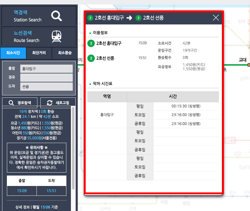 경로 탐색을 하게 되면 위와 같은 검색 결과를 확인할 수 있습니다. 2호선 홍대입구부터 2호선 선릉역까지 소요시간 42분 운임 구간 19개, 요금 1550원 (현금), 1450원 (카드)를 확인할 수 있습니다.