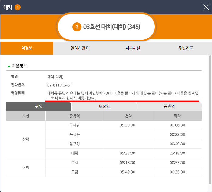 바로 대치역이 조회되고 표시된 역정보를 클릭하면 다음과 같은 대치역의 상세정보를 확인할 수 있습니다. 재미있는 것은 역명 유래가 표시되는데요.