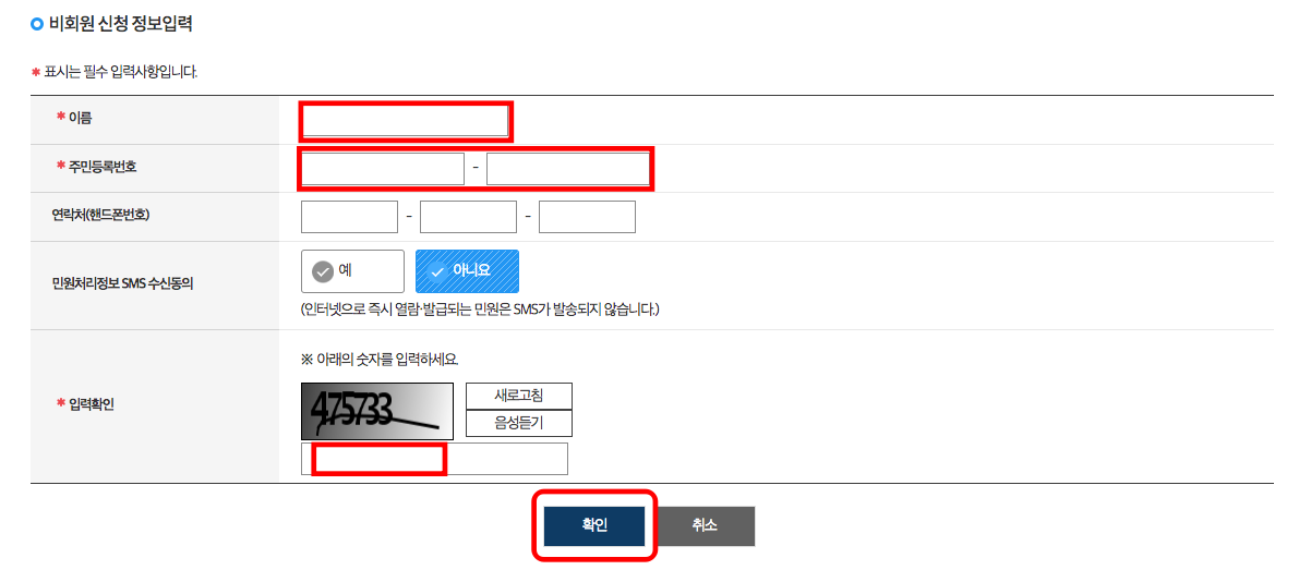 하단에서 비회원 신청정보를 이름, 주민등록번호, 입력 확인 순으로 입력하고 하단의 확인 버튼을 선택합니다.