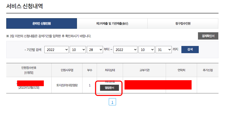 이후 서비스 신청내역 페이지로 이동하면 민원이 접수된 것을 확인할 수 있습니다. 처리상태에서 열람 문서를 클릭하시면 토지대장 무료열람이 가능합니다.
